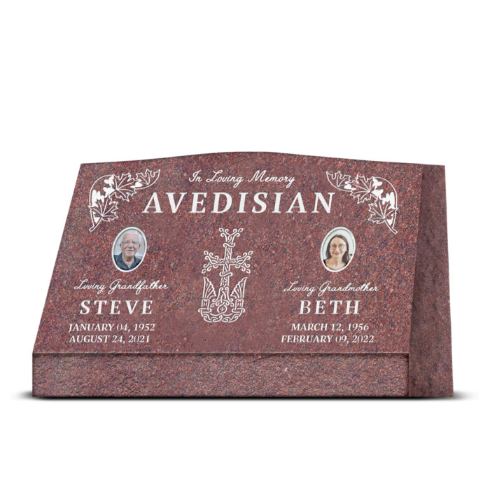 Slant headstones feature an angled face that offers excellent visibility while maintaining a compact, graceful profile. Their bold yet elegant design provides a timeless tribute to your loved one.